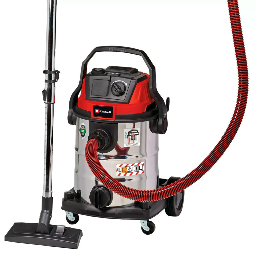 El aspirador en seco y húmedo TE-VC 2025 SACL de Einhell es ideal para limpiezas profundas en el hogar, taller u obra. Con motor ECO de 1.200 W y filtro HEPA, es apto para alérgicos y aspira tanto suciedad seca como líquida. Incluye función de soplado, enchufe para herramientas eléctricas y un depósito de acero inoxidable de 25 L. Robusto, versátil y fácil de transportar, es perfecto para suciedad intensa y zonas de difícil acceso.