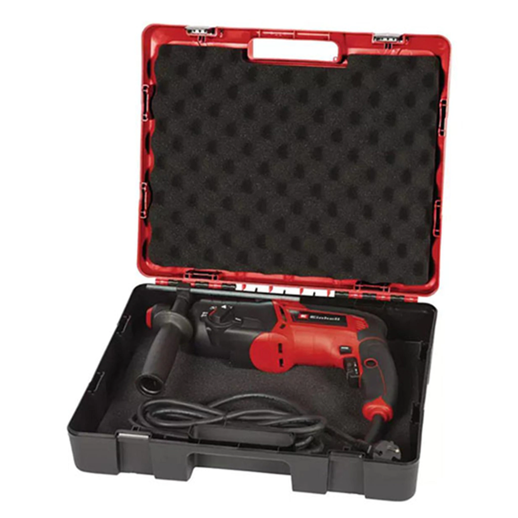 El taladro percutor TC-RH 800 4F de Einhell es un potente ayudante de 800 vatios con cuatro funciones básicas para trabajos de renovación y renovación: taladrar, taladrar con percusión y cincelar con y sin fijación.